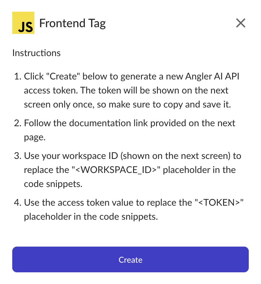 Click on the Frontend Tag Browser Events Integration button and click the create button on the popup window. This will generate a new Angler AI API access token. The token will be shown on the next screen only once, so make sure to copy and save it.