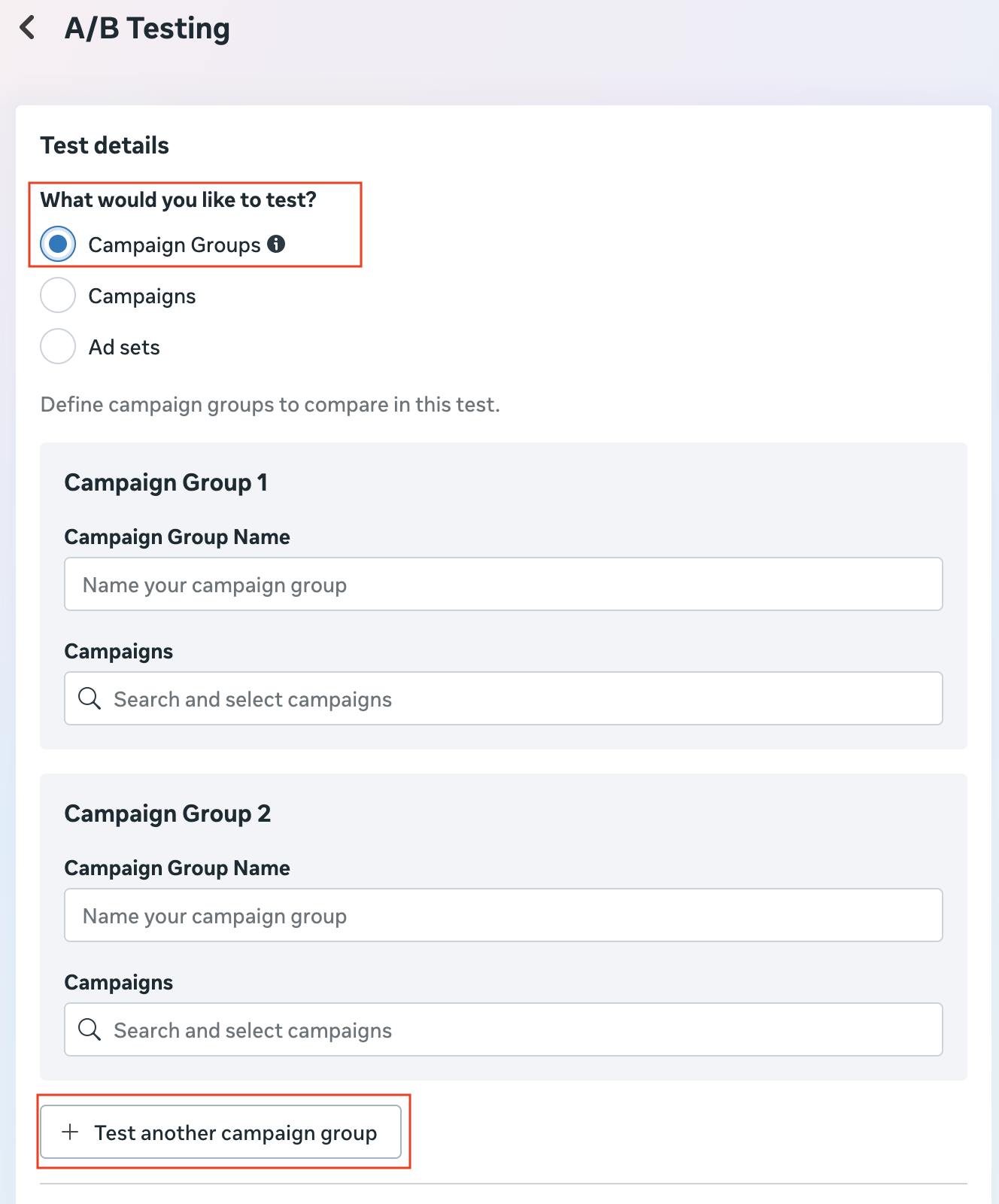 Since the sandbox requires an additional test cell (e.g., a third or fourth cell, depending on the number of test cells you’re running plus one for the sandbox), choose Test another campaign group to create this extra Campaign Group.