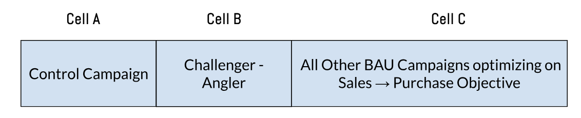 This structure ensures that both the control and challenger (Angler) test cells remain fully isolated from BAU campaigns—eliminating audience overlap and enabling a clean, reliable in-platform readout of test results.