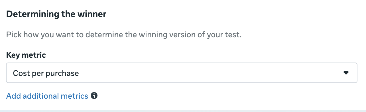 If the attribution window or model used in your test cells differs from that of your sandbox campaigns, you may need to adjust your key metric to an upper-funnel objective (for example, you might not be able to select Cost per Purchase as the key metric).